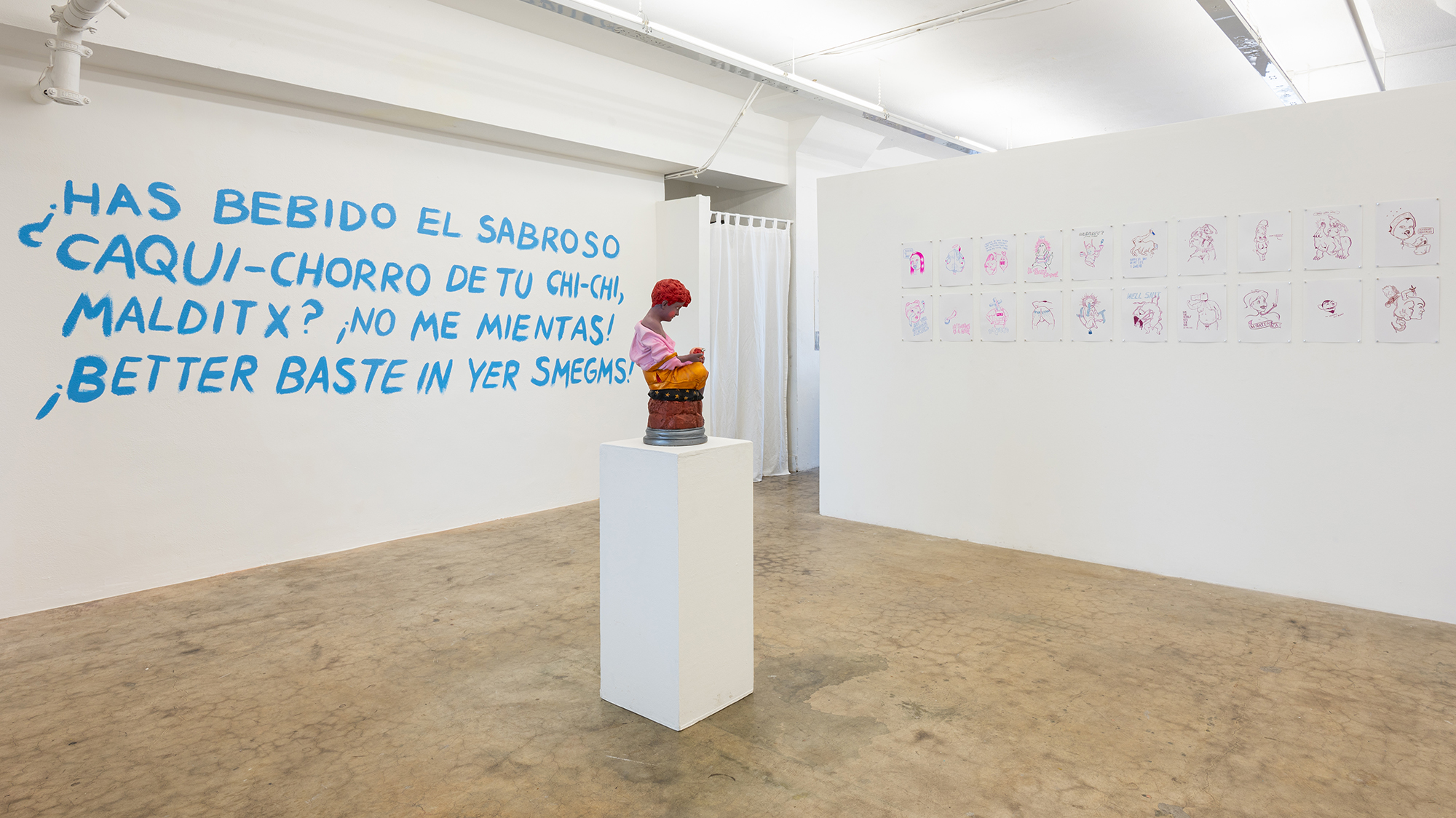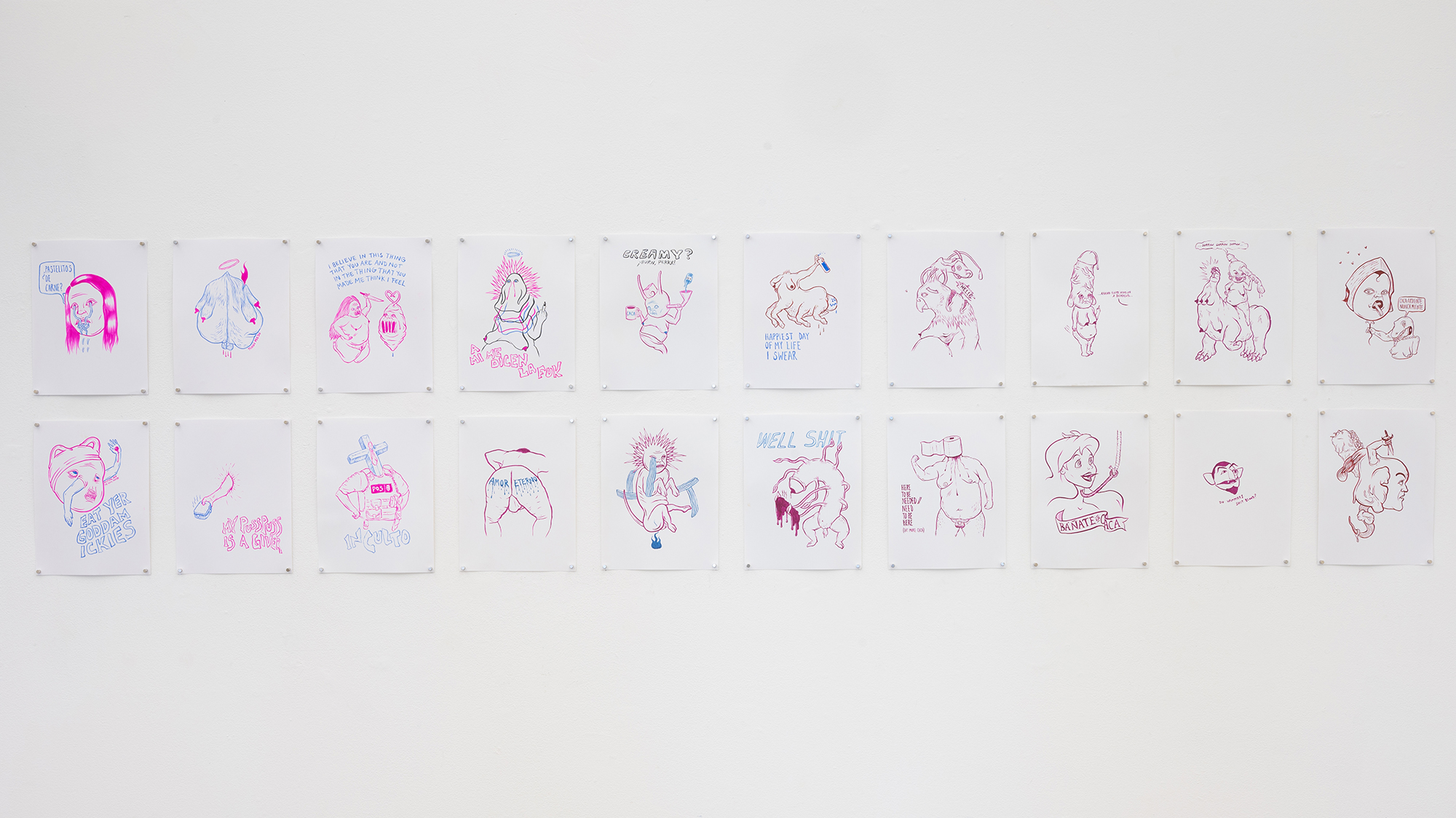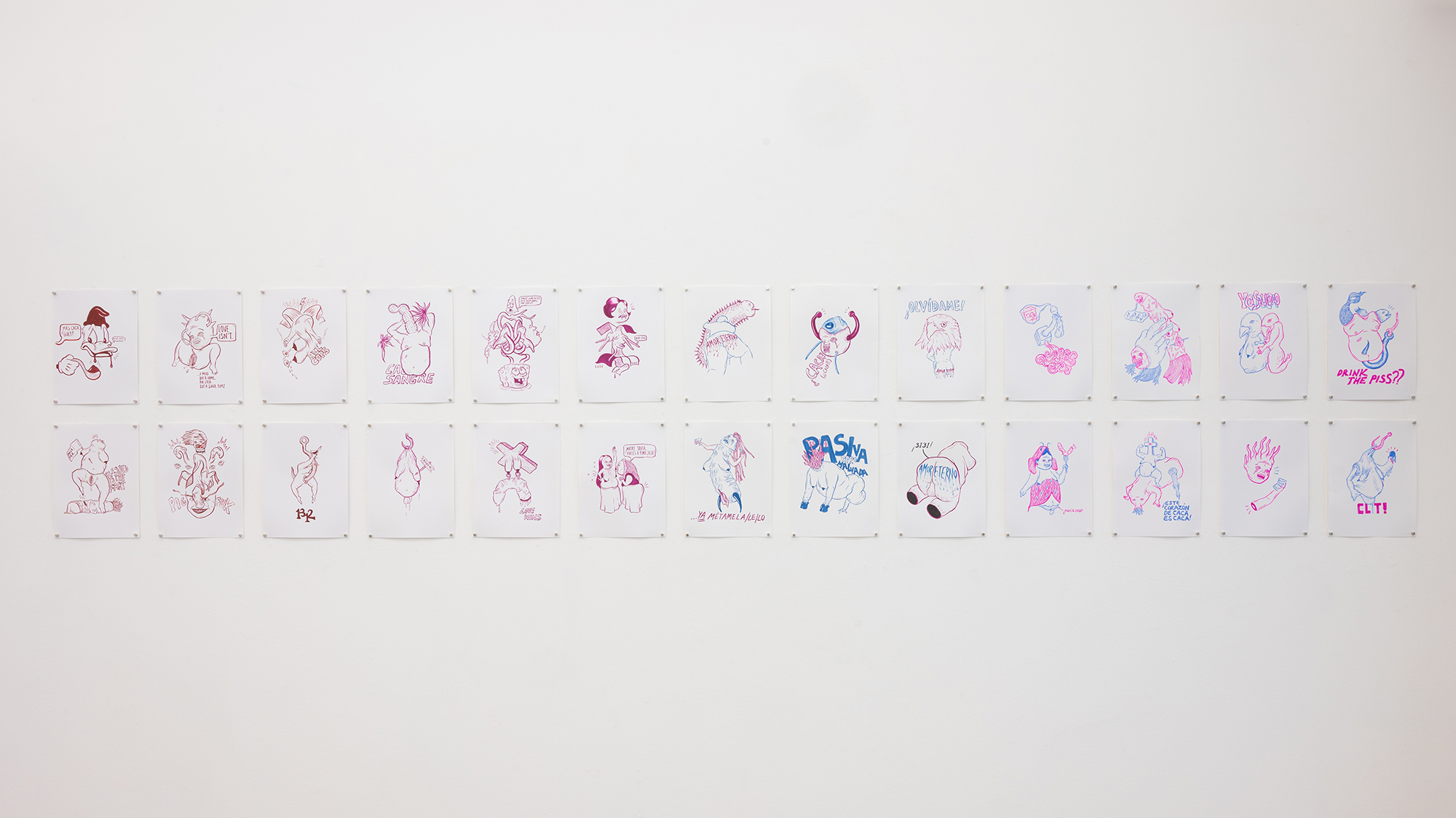 Monte Vista Projects is pleased to present Caca, the first U.S. solo exhibition of multidisciplinary artist Dorian Wood’s visual work. Caca emerges from Wood’s nightly ritual of documenting the world’s troubles and follies through ink-based illustrations that depict swirling genitalia, gender-absent bodies, distorted icons and coprophagic musings. Over the past 10 years Wood has amassed hundreds of these “disruptive self portraits.” Caca collects a selection of these illustrations, grouped into series by ink color, and will include a mural on the gallery’s north wall created by Wood specifically for the exhibition, keeping with the artist’s ongoing intent of “infecting” spaces.